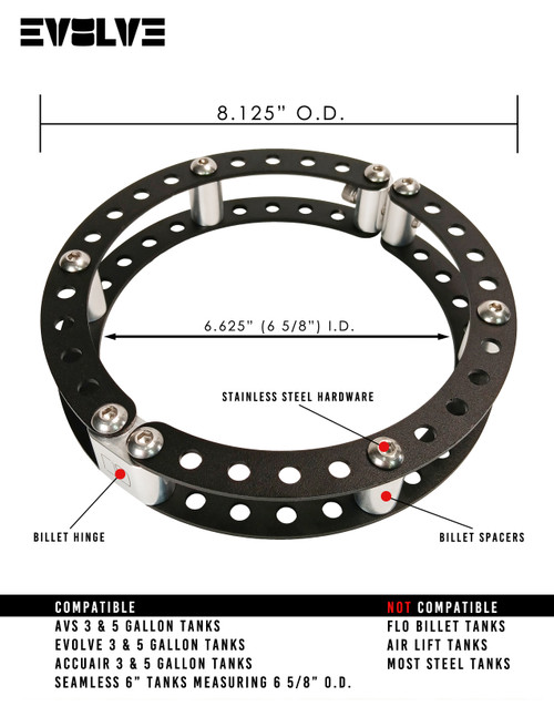 Our EVOLVE Tank Clamps are compatible with any 6.625" (6-5/8") diameter air tank.  Here's a few: