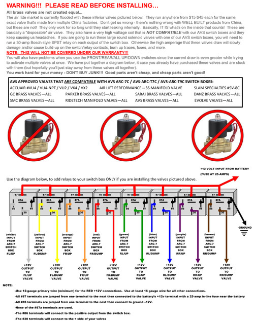 The air ride market is currently flooded with these inferior valves pictured below. They run anywhere from $15-$45 each for the same exact valve that's made from multiple China factories. Don't get us wrong - there's nothing wrong with WELL BUILT products from China, but these are not! They only work for so long until they start leaking internally. Basically, IT IS what's on the inside that counts! These are basically a "disposable" air valve. They also have a very high wattage coil that is NOT COMPATIBLE with our AVS switch boxes and they keep causing us headaches. If you are going to run these large round solenoid valves with one of our AVS switch boxes, you will need to run a 30-amp Bosch style SPST relay on each output of the switch box. Otherwise the high amperage that these valves draw will slowly damage and/or cause build-up on the switch/relay contacts, burn up traces, fuses, and more. You will also have problems when you use the FRONT/REAR/ALL UP/DOWN switches since the current draw is even greater while trying to activate multiple valves at once. We have put together a diagram on our instructions (link above), it case you already have purchased these valves and are stuck with them (but hopefully you'll just stay away from these valves all together). We are not trying to compete with these cheap knockoff valves, so it is very important to us that we warn you. We want you to spend your money wisely - keep your sanity - and have a trouble-free air ride system. So please do yourselves a favor and stay clear of the valves in the pic below!!! You would be much better off with a DANZ, PARKER, SMC, GC or SARAI valve (which we don't even sell, so why would we lie to you?).