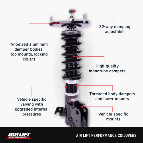 Air Lift Performance is taking a new stance (pun intended) on Performance Suspension. Introducing our new Coilover Suspension Kits, built for enthusiasts who want a lowered stance without the need for air adjustability. These high-quality, feature-packed coilovers offer a sportier ride and handling, making them ideal for both daily driving and passionate weekend drivers. With the ability to convert to a complete air suspension system via a coilover-to-air conversion kit (coming soon), you can permanently enjoy your new static stance or convert to air when you're ready and lay your ride on the ground.