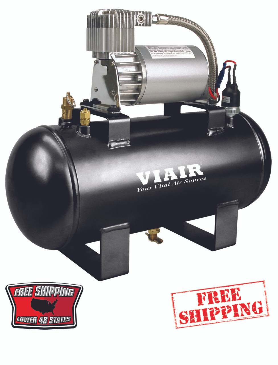 120 PSI Air Source Kits come with a low amp-draw, 25% duty cycle, 275C VIAIR compressor mounted on a 150 PSI-rated 1.5 gallon air tank with 5 ports. All Air Source kits come with a pre-wired pressure switch (P/N 20003 / 90-120 PSI). The 120 PSI Air Source Kit comes complete with a 1/4” NPT brass drain cock, 1/4” NPT ASME coded and certified safety valve, 1/2” NPT port compression fitting for 3/8” air line pre-installed. To use, simply connect the pressure switch to fused power, make a solid ground and connect an air line to the compression fitting. The use of a 40-amp relay and an appropriately-rated fuse is strongly recommended to preserve the life of the pressure switch.
