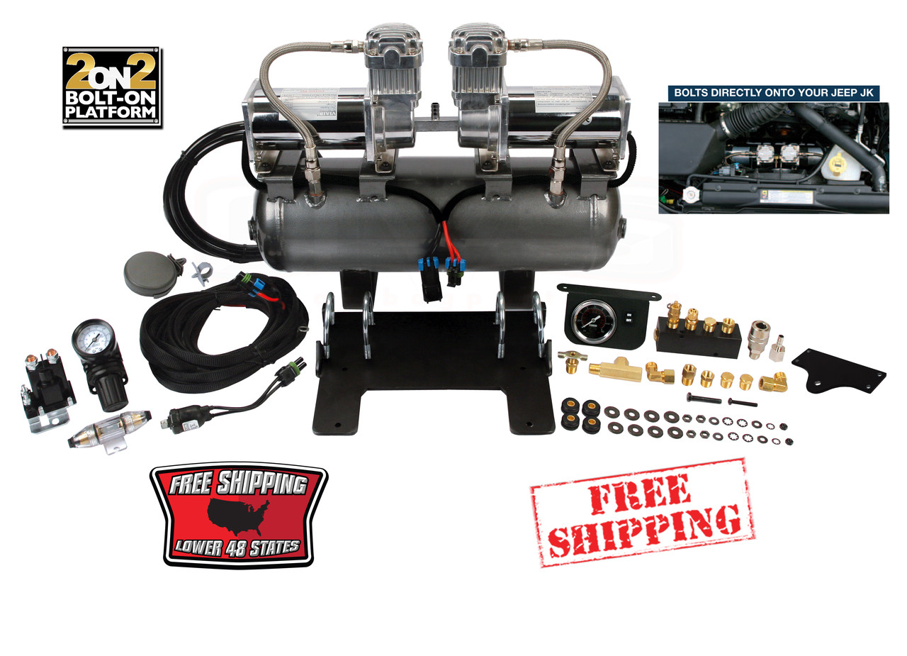 Using two high output compressors mounted to a 2.0 gallon, 5-port air tank all required components are included to allow the installation of a high speed onboard air system that provides 150 PSI maximum pressure. Available as a model-specific bolt-on application for 2007-2011 Jeep JK with a crossmember mounting bracket – 2on2 systems all come complete with an easy-to-install wiring harness and manifold to make wiring and plumbing the system straightforward.
