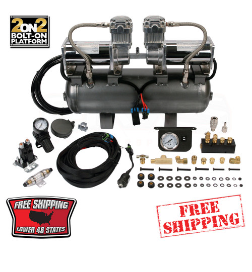 Using two high output compressors mounted to a 2.0 gallon, 5-port air tank all required components are included to allow the installation of a high pressure onboard air system that provides 200 PSI maximum pressure. 2on2 systems all come complete with an easy-to-install wiring harness and manifold to make wiring and plumbing the system straightforward.