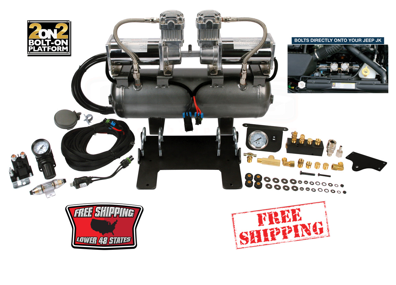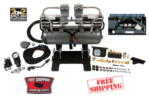 Using two high output compressors mounted to a 2.0 gallon, 5-port air tank all required components are included to allow the installation of a high pressure onboard air system that provides 200 PSI maximum pressure. Available as a model-specific bolt-on application for 2007-2011 Jeep JK with a crossmember mounting bracket – 2on2 systems all come complete with an easy-to-install wiring harness and manifold to make wiring and plumbing the system straightforward.