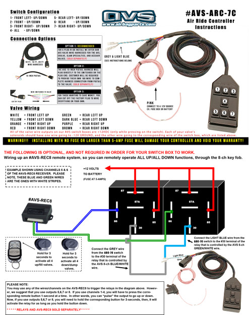 AVS is the pioneer of air ride switch boxes. We've been at it before we were even AVS (making switch boxes since 1999). Our AVS 7C-switch box will feel right at home in your hand, and has a solid, quality feel to it. You will be able to control individual corners, front up/down, rear up/down, and ALL up/down. No digital electronics to go haywire here! Only "old school" analog technology that you can rely on. If you are iffy about the "computerized" systems that are currently on the market, then this is the switch box that you can depend on (as long as you don't spill your Big Gulp on it!).